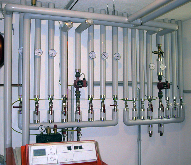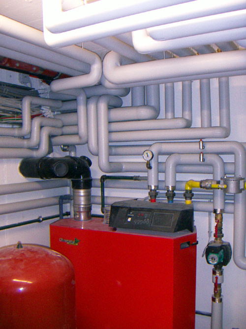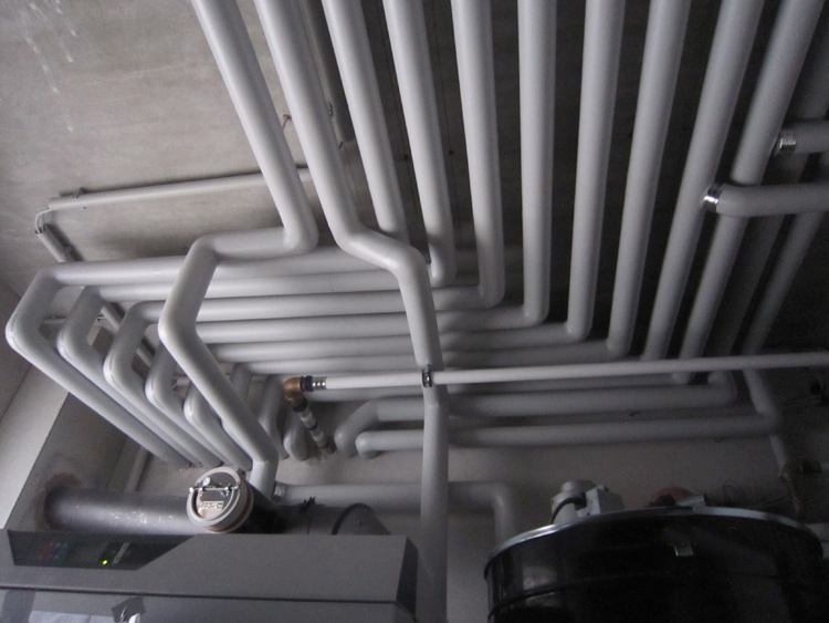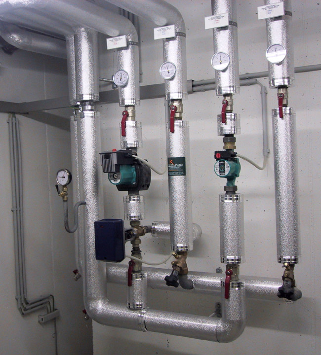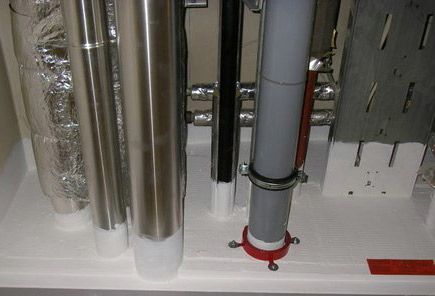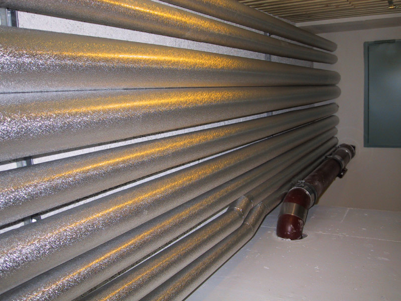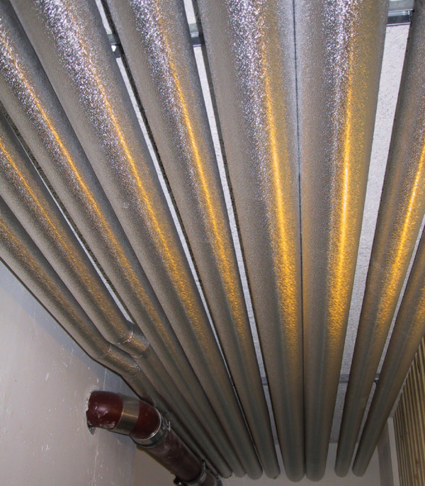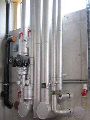Eine einseitig mit einer gitternetzverstärkten Aluminiumfolie kaschierte Lamell- oder Steinwollmatte sowie Rohrschalen werden angebracht.