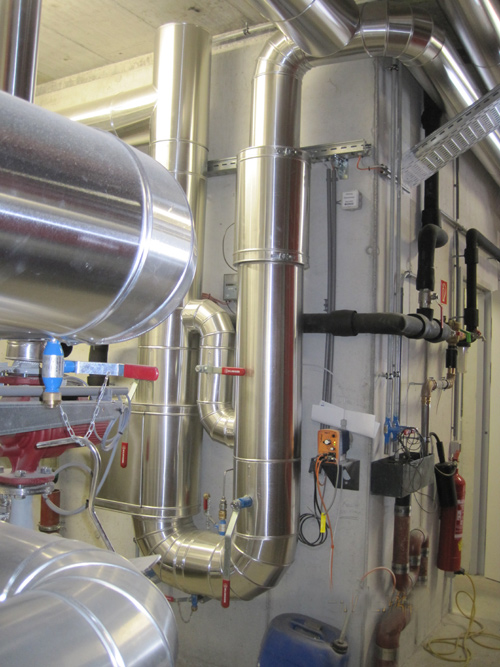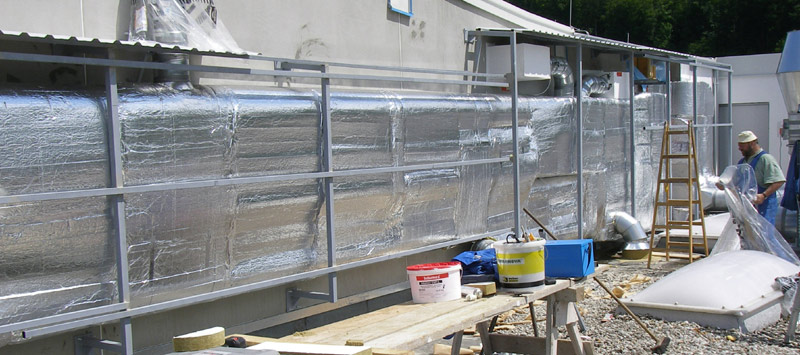 Über die mit gitternetzverstärkter Aluminiumfolie kaschierte Lamell- oder Steinwollmatte sowie die Rohrschalen kommt ein Mantel aus Isogenpak (PVC) in der Stärke 0.35 mm.